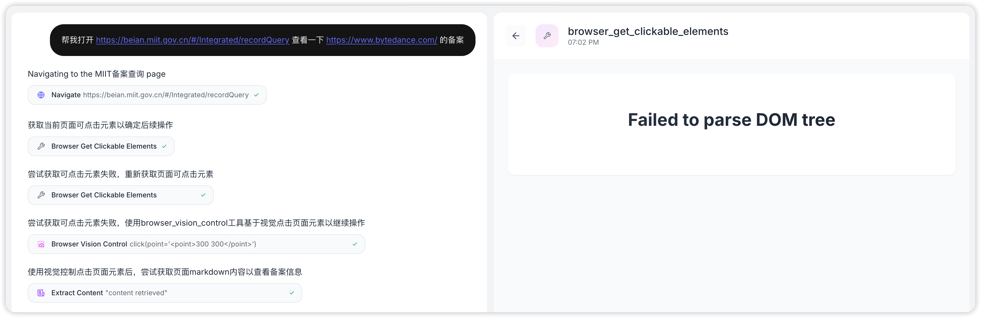 Essentially, the model performs grounding and returns specific coordinates and content for interaction, which are then executed by the browser operator. The example task above underwent three outputs, parsed as follows: