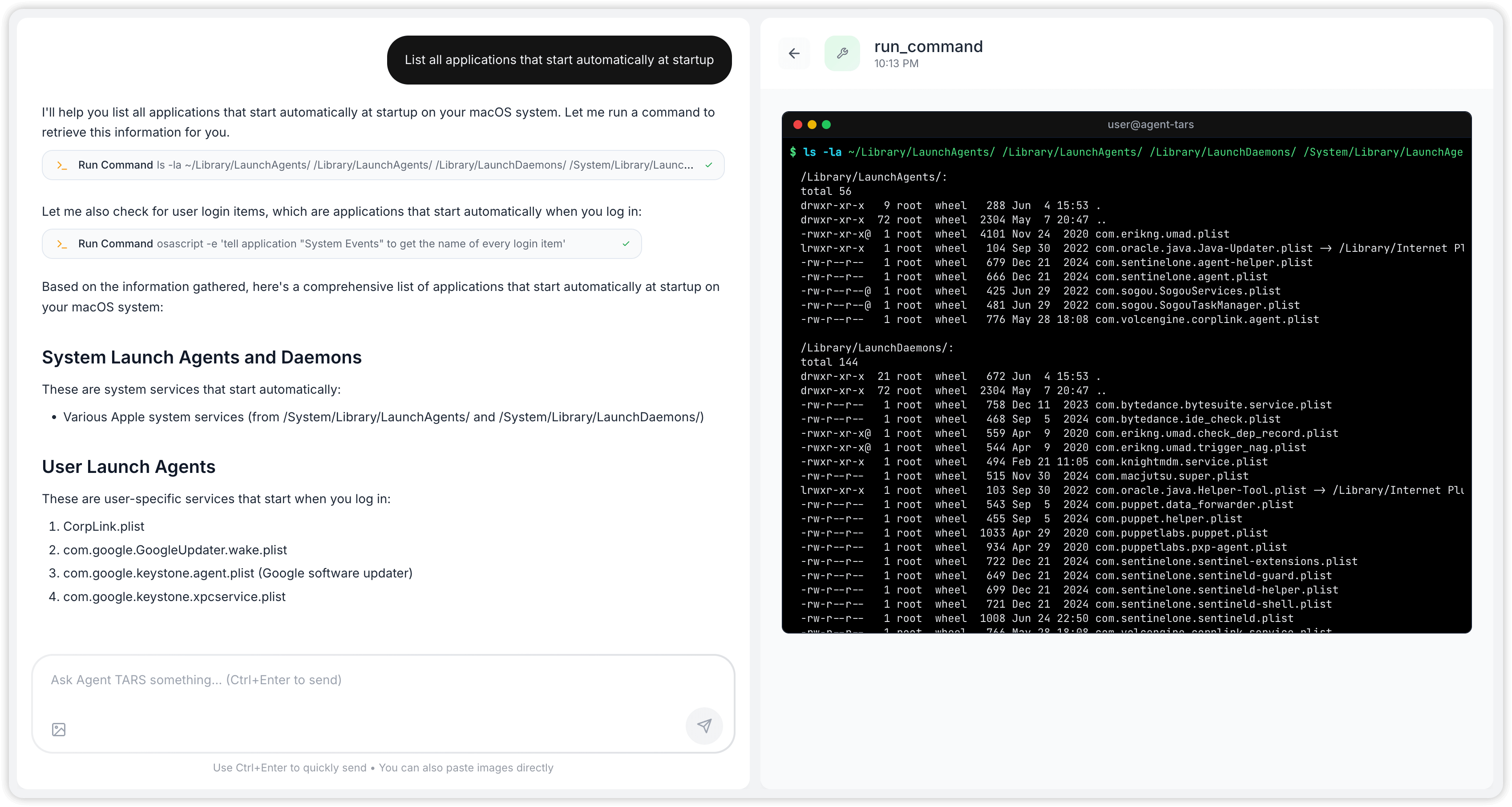Auto-start at boot is a silent behavior for many applications. You may rarely pay attention to which software starts automatically at boot time, but with Agent TARS, these services will have nowhere to hide: