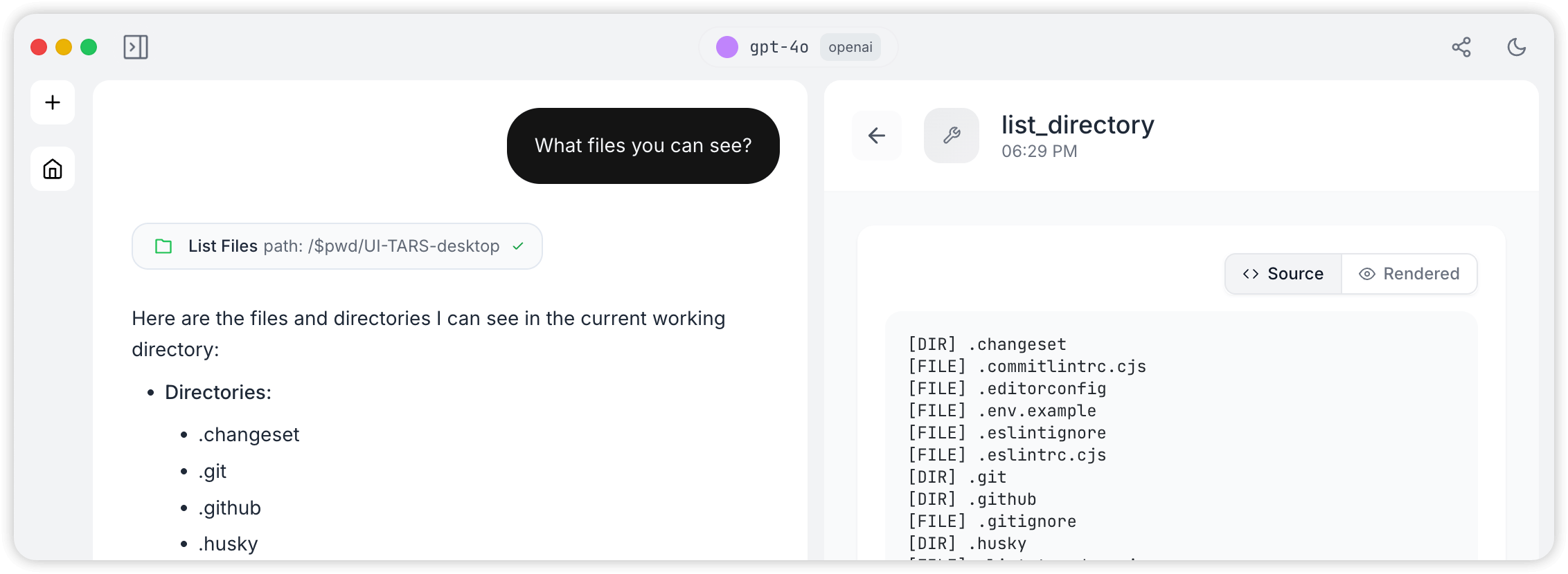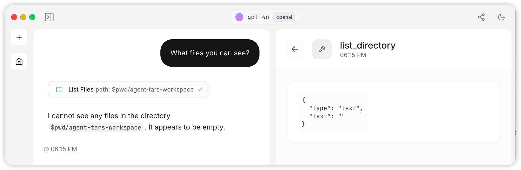 To avoid affecting your local file system, the default value of Workspace is $pwd/agent-tars-workspace, which adds a layer of isolation. When you ask Agent TARS what files it can see: